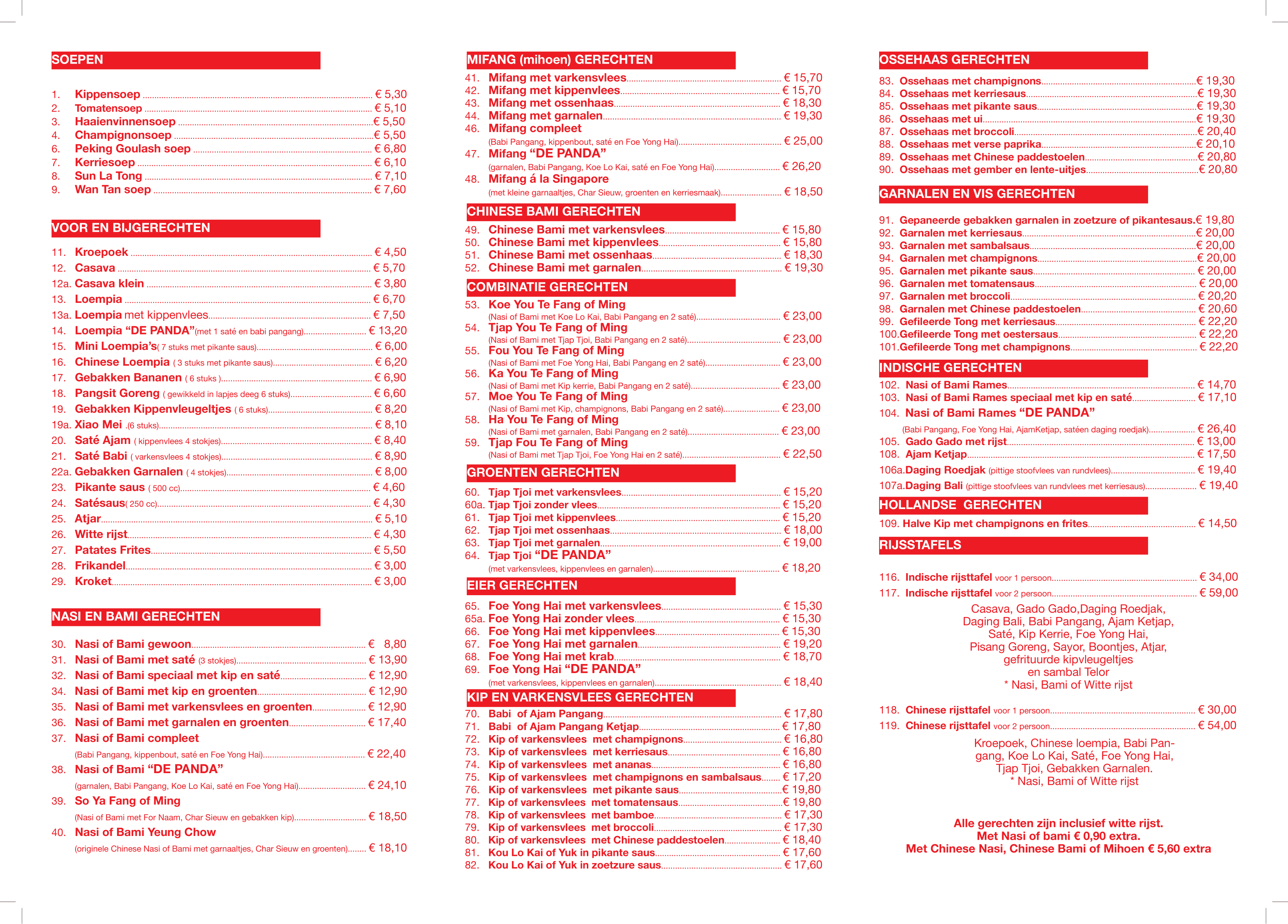 Casava, gebakken bananen, Foe Yong Hai, Babi Pangang, Koe Loe Kai, Kip met pikante saus en Ossenhaas met uien. Keuze uit één grote bak: Witte rijst (€0,00), Nasi (+€1,80), Bami (+ €1,80), Chinese Nasi (+ €9,00), Chinese Bami (+ €9,00) of Mihoen (+ €9,00).